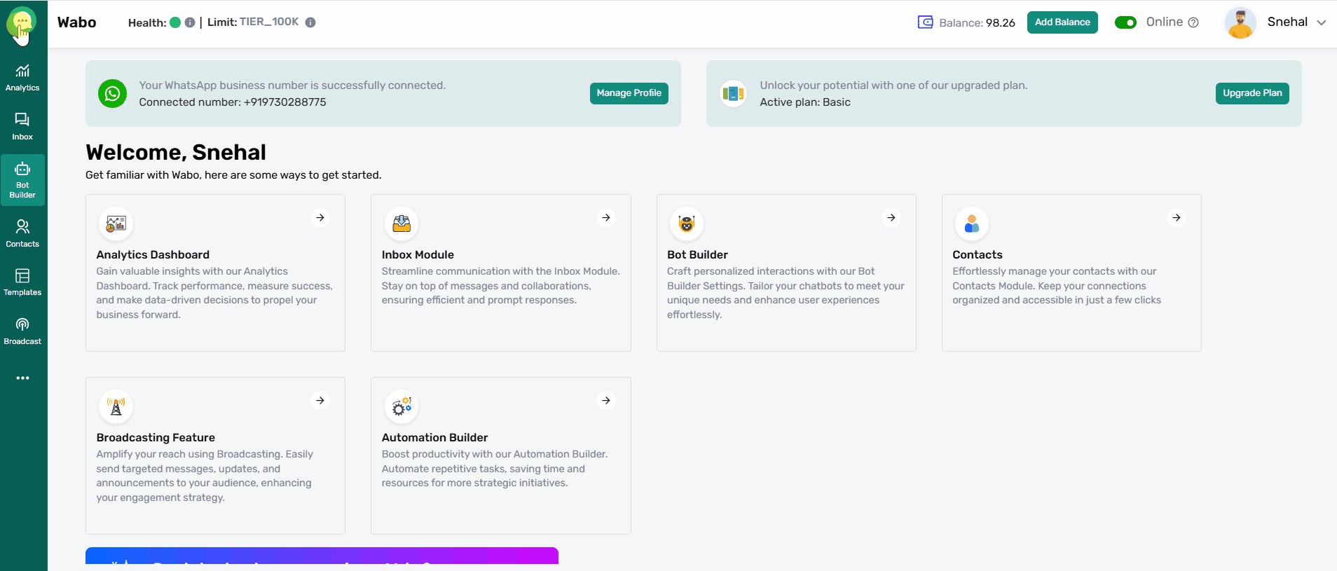 On the left-hand side, navigate to the Bot Builder module in Wabo.