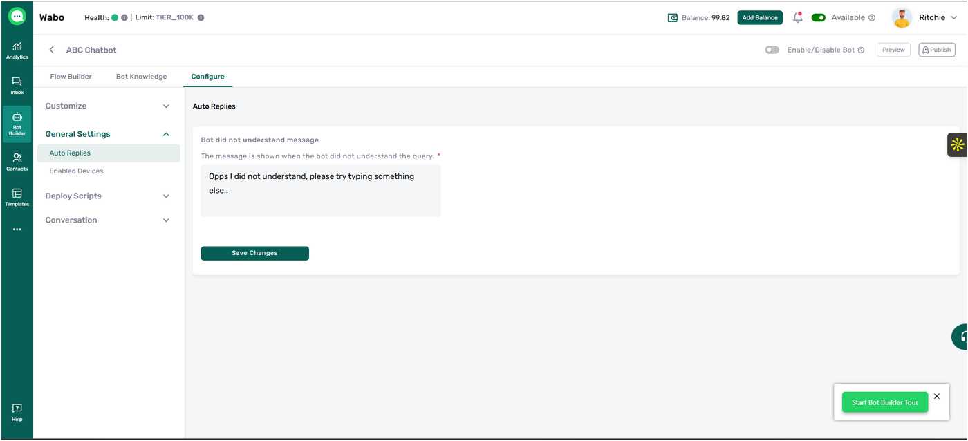 Follow these steps to configure fallback messages in Wabo when the bot cannot understand a user query: