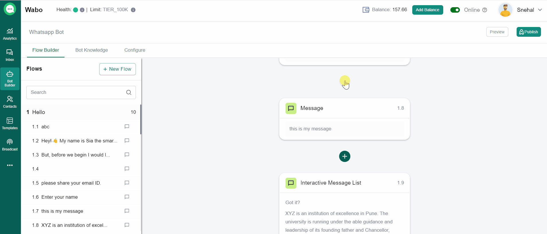 - Navigate to the Flow Builder section to add or edit a bot flow.