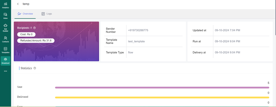 Overview: Displays key metrics like Costs, Statistics (Sent, Delivered, Seen, Replied, Failed), Sender Number, Template Name, and Template Type.