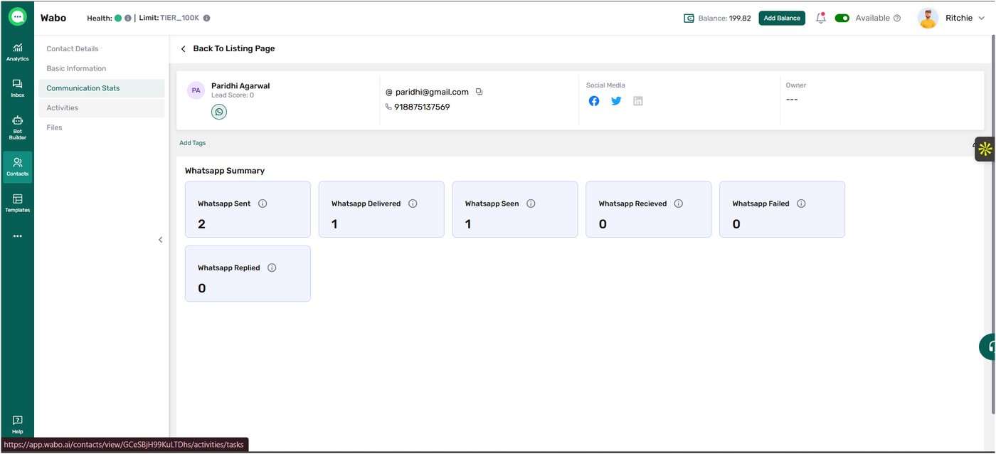 Contact Communication Stats help you understand how a contact has interacted with your WhatsApp communications. This includes messages sent, delivered, seen, replied to, or failedβallowing you to track engagement and improve follow-up strategies.