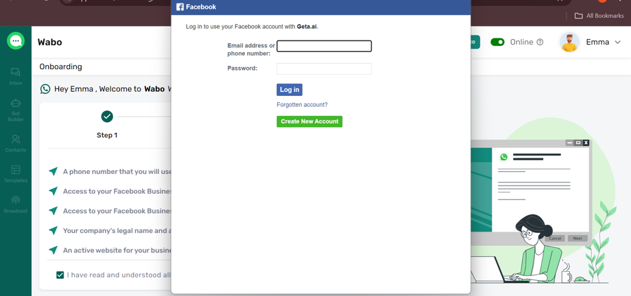 To onboard your WhatsApp number to Wabo.ai’s platform, follow these steps: