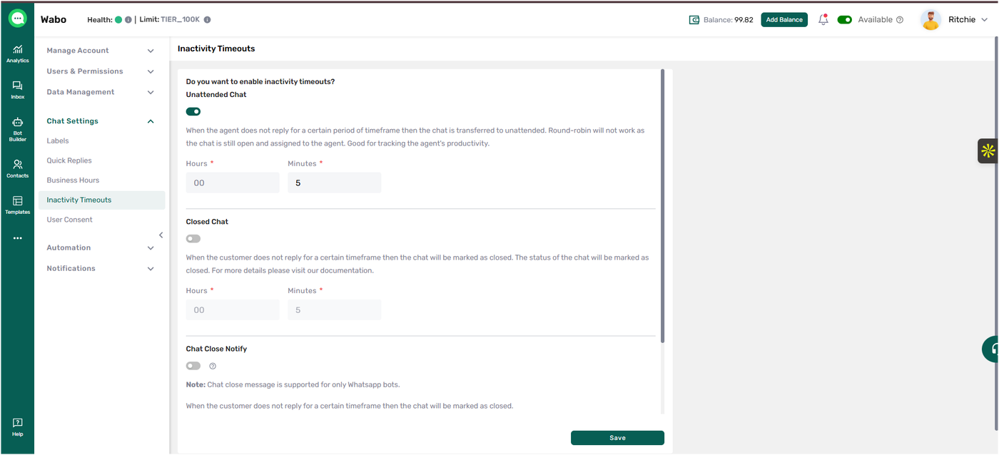 Inactivity timeouts allow you to manage how long a chat remains unattended or open without activity. You can set specific time limits for both unattended chats (when agents don't respond) and closed chats (when customers don't reply) & whenever the chat is closed you can send them an automated chat closed message as well. This helps track agent productivity and manage chat flow efficiently.