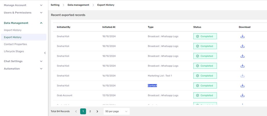 Export history helps users track and manage data exports from the platform, such as contact lists, broadcast logs, and more. Follow these steps to view and download exported records.
