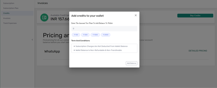- Click on Buy Credits, enter the amount, review terms and conditions, and complete the payment.