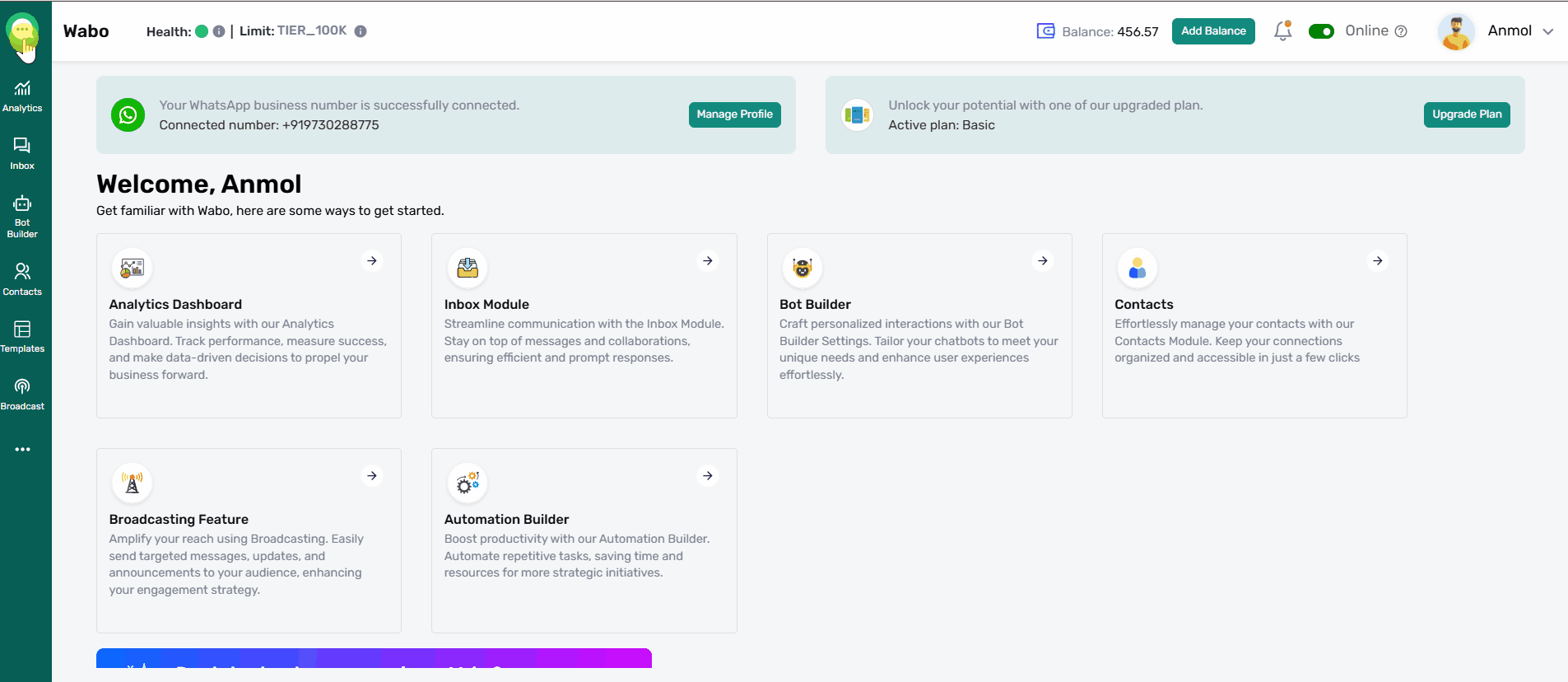 Locate Task: After logging into Wabo, navigate to the Task section below WhatsApp Flows.
